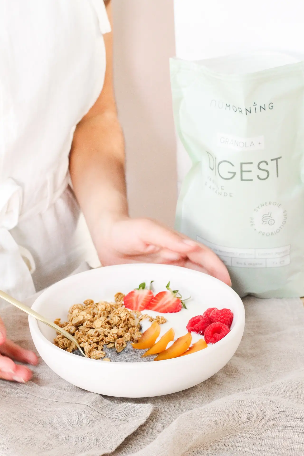 Boostez votre digestion avec le Granola Digest Vanille & Probiotiques nümorning : 10 milliards de ferments naturels par portion, sans sucres raffinés, gourmand et sain à La Réunion.